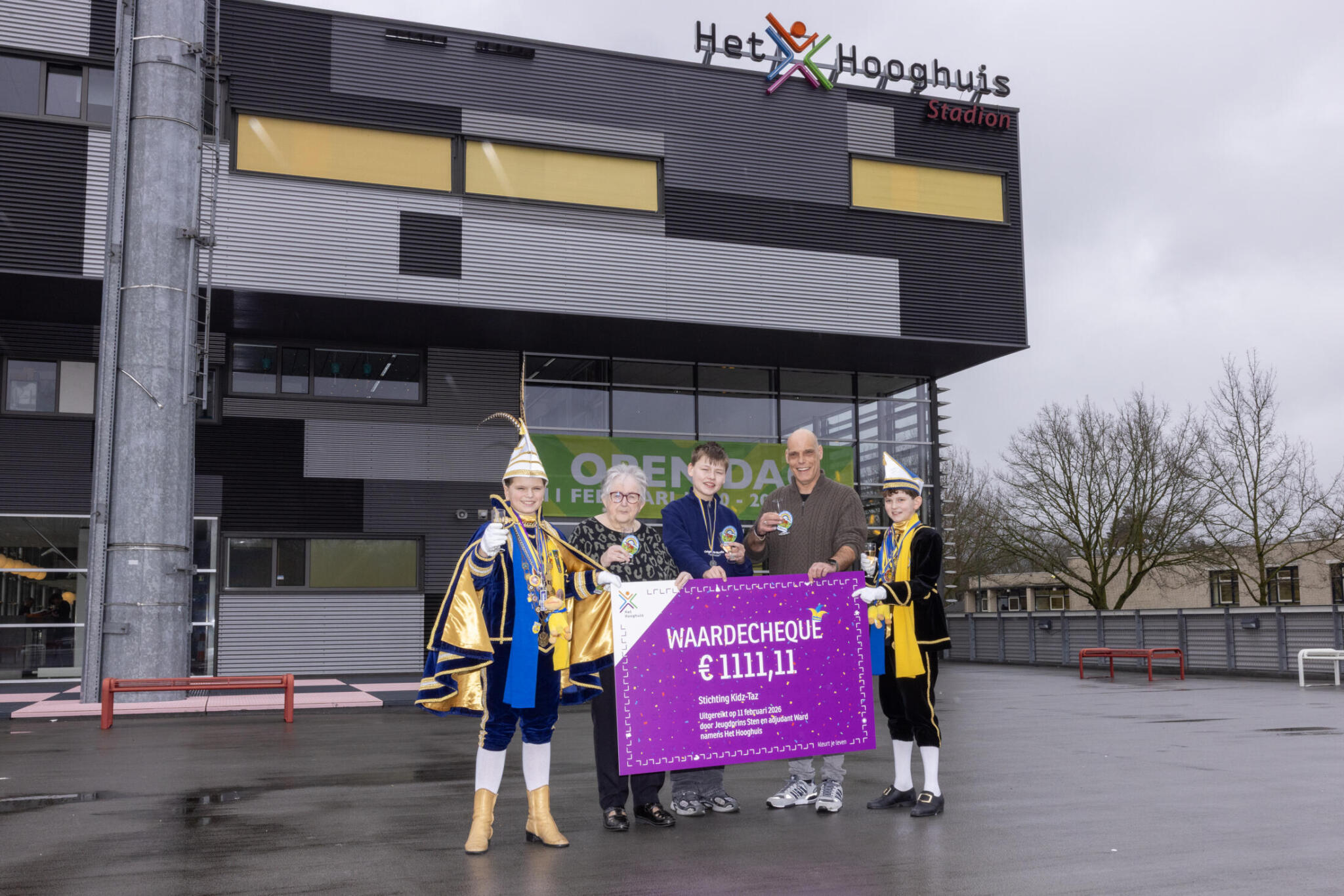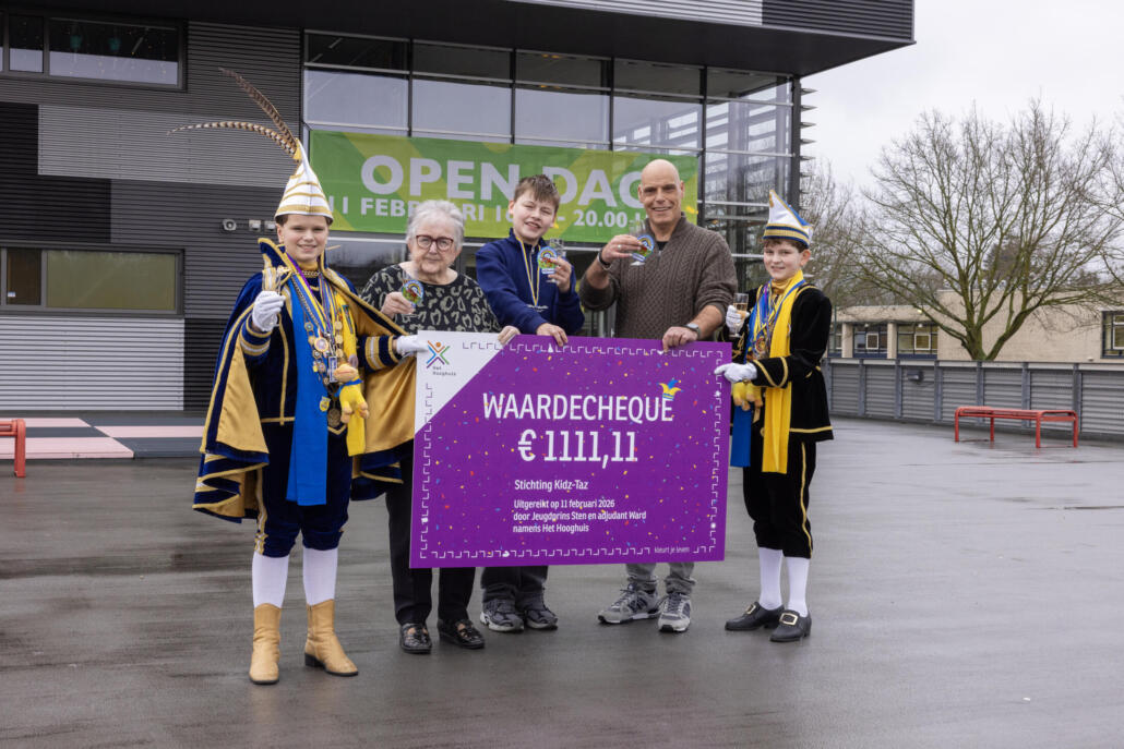 Een feestelijke middag vol warmte en dankbaarheid in Ossekoppenrijk. Jeugdprins Sten (11) en zijn adjudant Ward (11) overhandigen namens onze scholengroep een cheque ter waarde van € 1.111,11 aan Annie (bijna 84) en Dave (57) van Stichting Kidz-Taz in Oss. De opbrengst komt volledig ten goede aan kinderen uit gezinnen die het financieel moeilijker hebben, zodat ook zij een feestje kunnen blijven vieren. De cheque is onder andere het resultaat van de verkoop van het speciale carnavalsembleem van Het Hooghuis, dat een groot succes bleek. Het kleurrijke embleem werd de afgelopen weken uitgereikt aan onze leerlingen en collega’s en volop verkocht bij het nieuwe Warenhuis in Oss.