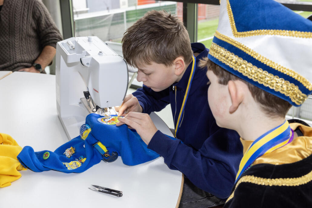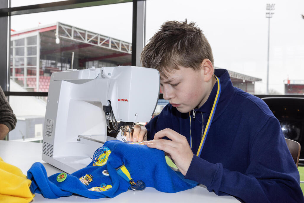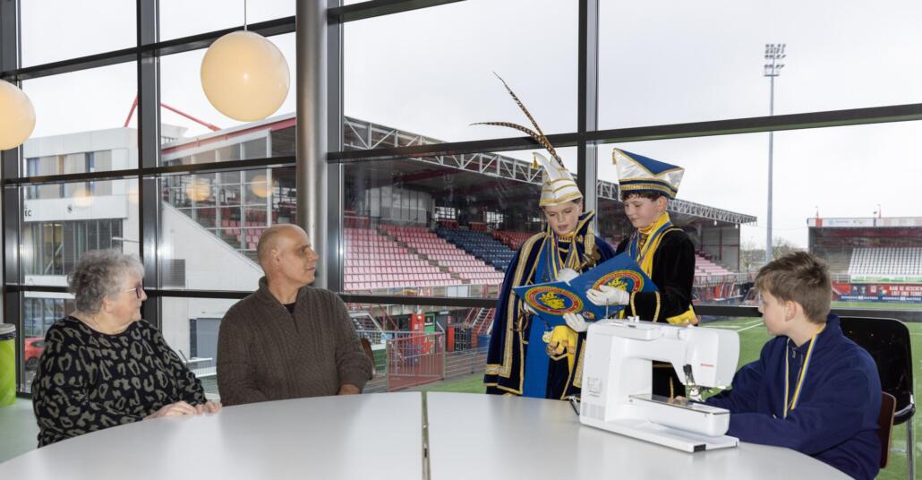 Natuurlijk mogen de vrijwilligers, jeugdprins en adjudant ook een uniek carnavalsembleem in ontvangst nemen. Een bijzonder detail: het embleem werd meteen door de Heesche Jorn (15), leerling van Het Hooghuis De Singel, genaaid op de carnavalssjaals van Sten, Ward, Dave en Annie. Hij vertelt enthousiast: “Ik vond het heel leuk dat ik voor de jeugdprins, adjudant en de vrijwilligers van Kidz-Taz het embleem erop mocht naaien. Eerst kon ik dit nog niet, maar juffrouw Diana van Lieshout heeft het me stap voor stap geleerd. Fijn dat ik ook op deze manier mijn bijdrage heb kunnen leveren!”